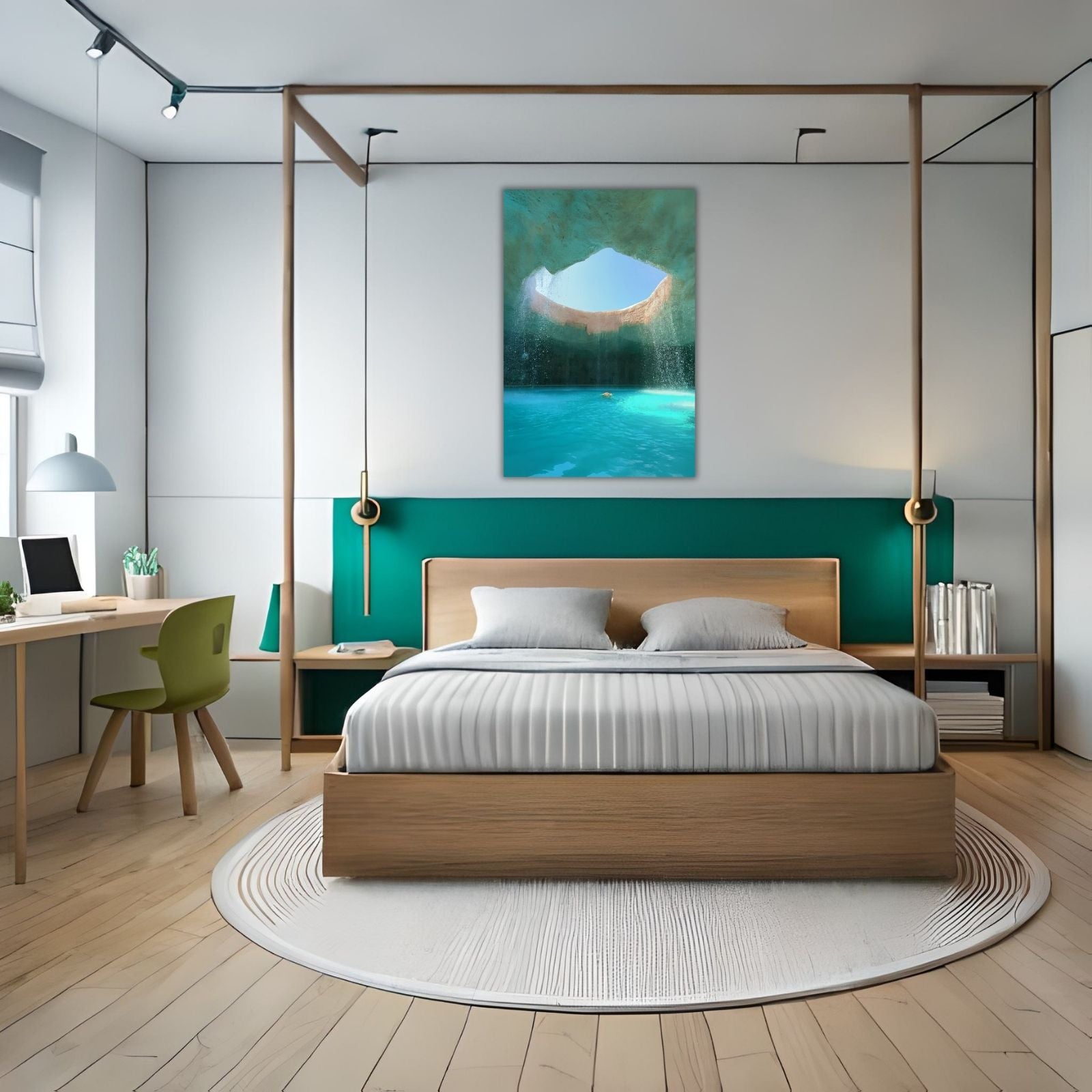 A Hidden Oasis of Light and Liquid Serenity Azure Grotto is a mesmerizing work of modern landscape art that captures the ethereal beauty of a secret underwater world. This piece is more than just decoration; it is designed for those who want immersive wall art for spa-like bathrooms, master retreats, and quiet meditation spaces that tells a story of discovery and profound calm.