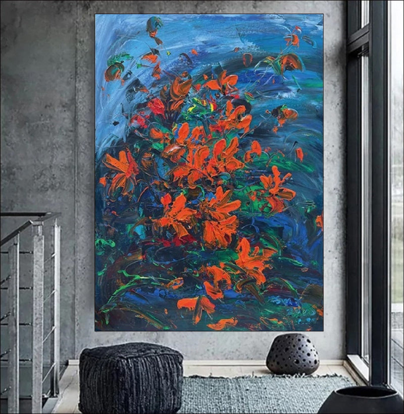 This vibrant handmade painting of red flowers on a blue background is a captivating work of art that brings energy and elegance to any space. Crafted with premium materials and detailed textured brushstrokes, it showcases the beauty of nature with bold and striking colors. Perfect for nature-inspired decor, Add this stunning flower and abstract art on canvas to your collection and transform your walls into a gallery of timeless beauty.