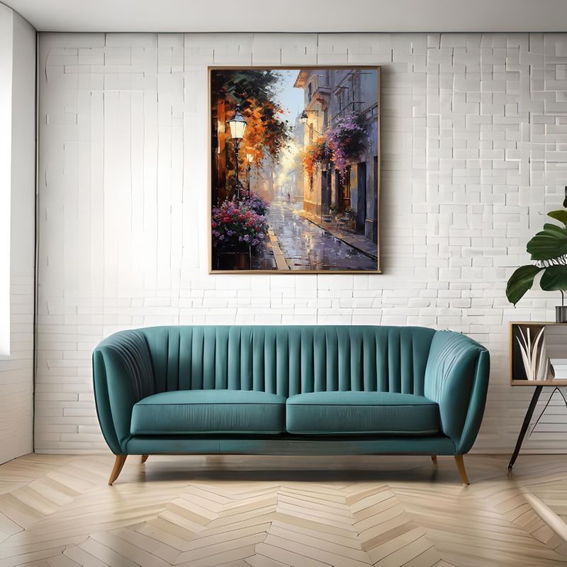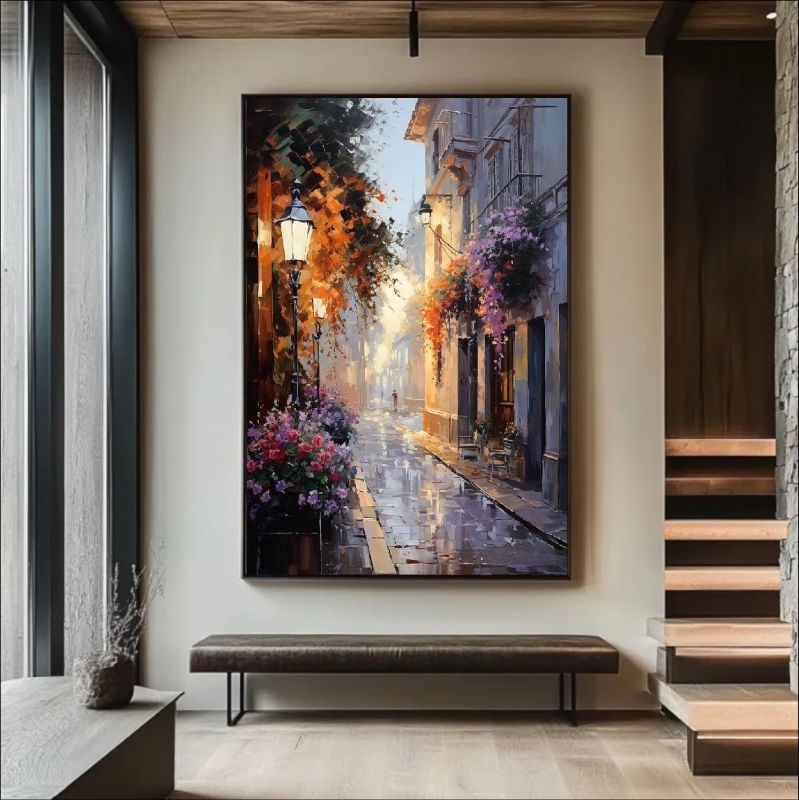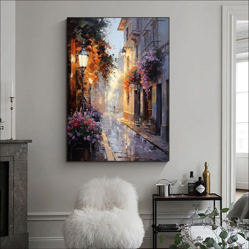 Experience the romantic allure of "Charming Alley: A Rain-Kissed European Retreat," a stunning artwork that captures the essence of a serene cobblestone street adorned with vibrant blooms and glowing lanterns. Perfect for those who appreciate "European street art," "romantic rainy scenes," or "flower-lined pathways," this piece brings timeless elegance and tranquility to any space. The rain-soaked cobblestones and soft golden light evoke a sense of calm and nostalgia, making it ideal for enhancing homes, offices, or boutique interiors. Celebrate the beauty of quiet moments and scenic escapes with this captivating masterpiece.