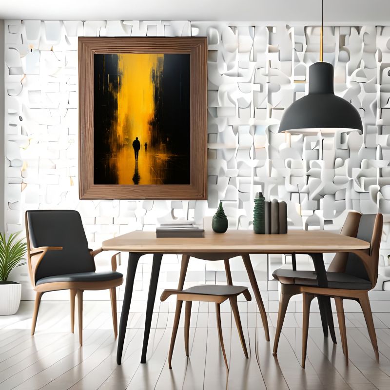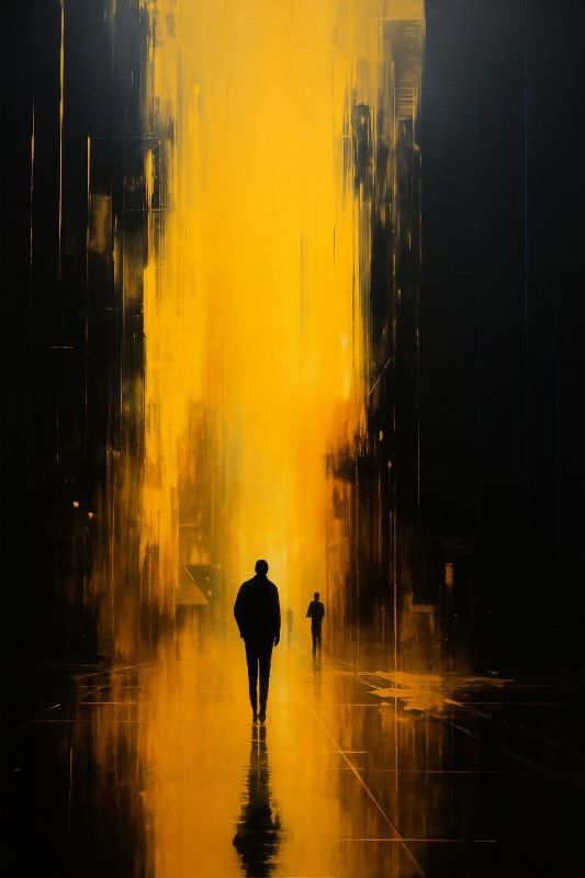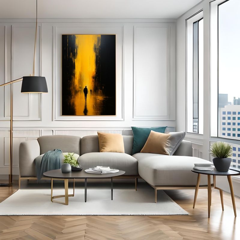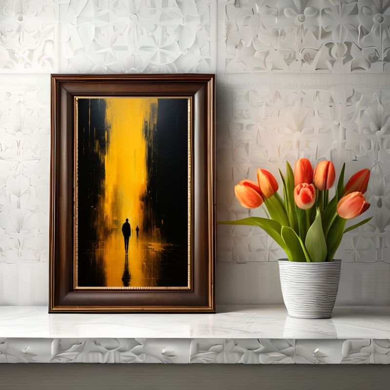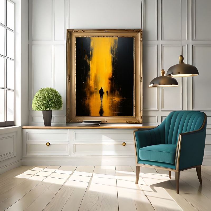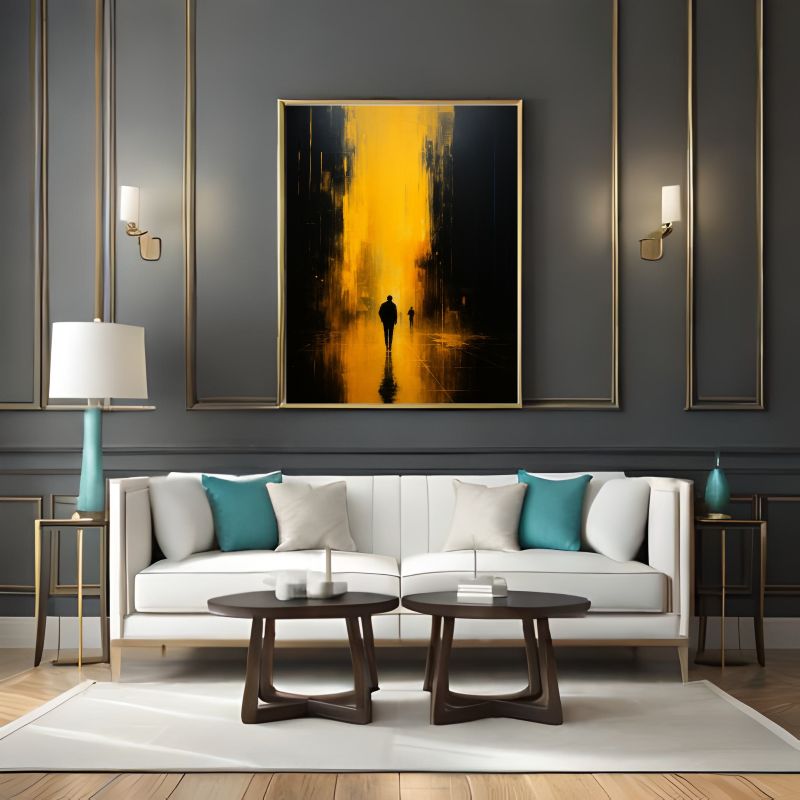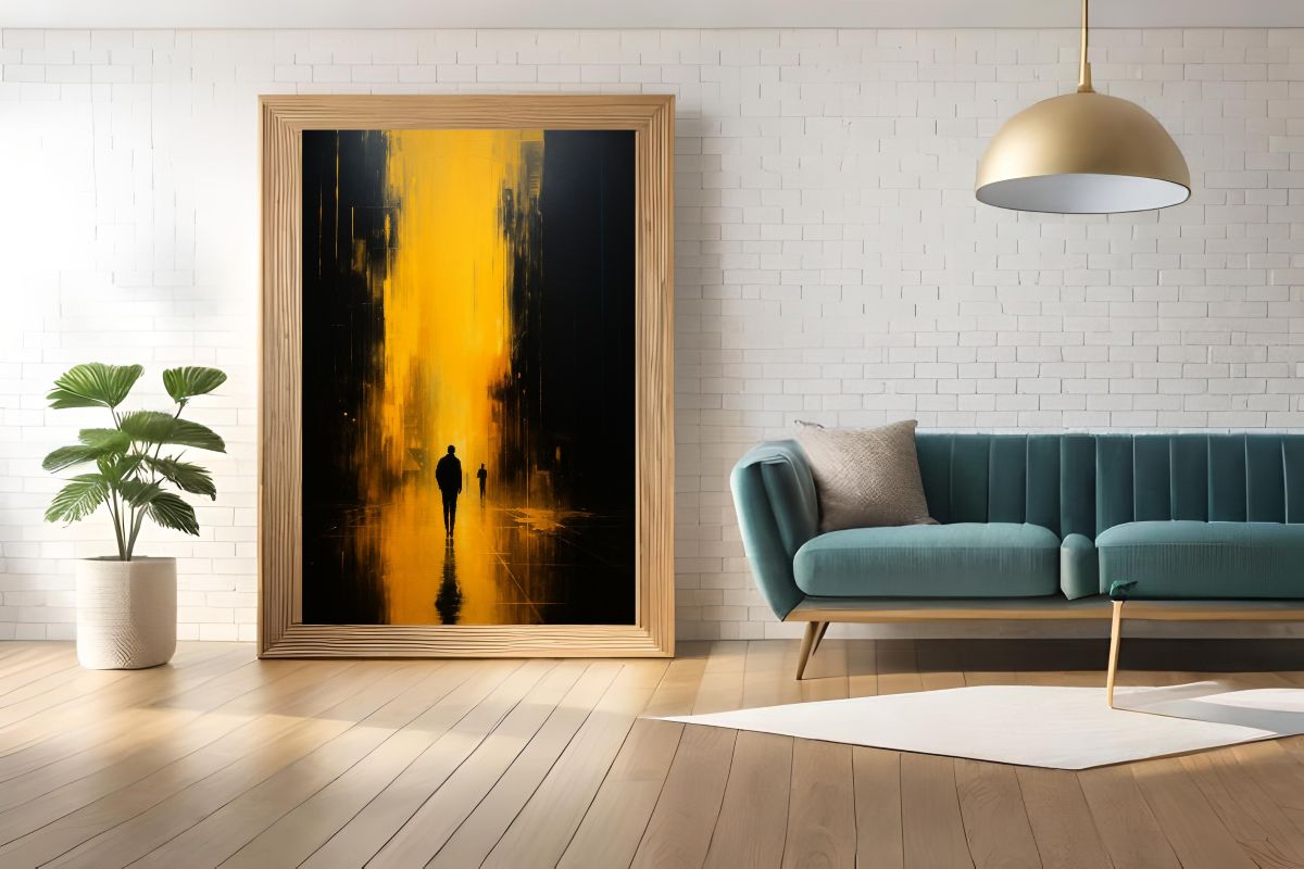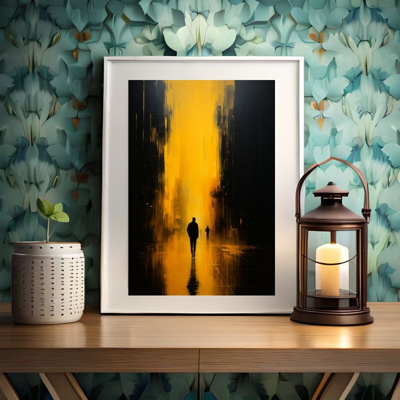 Immerse yourself in the glow of urban life with this abstract cityscape wall art, featuring golden light and shadowy silhouettes. Perfect for modern home décor, this contemporary city artwork adds elegance and depth to living rooms, offices, or gallery walls. A radiant statement piece for lovers of urban abstract art.