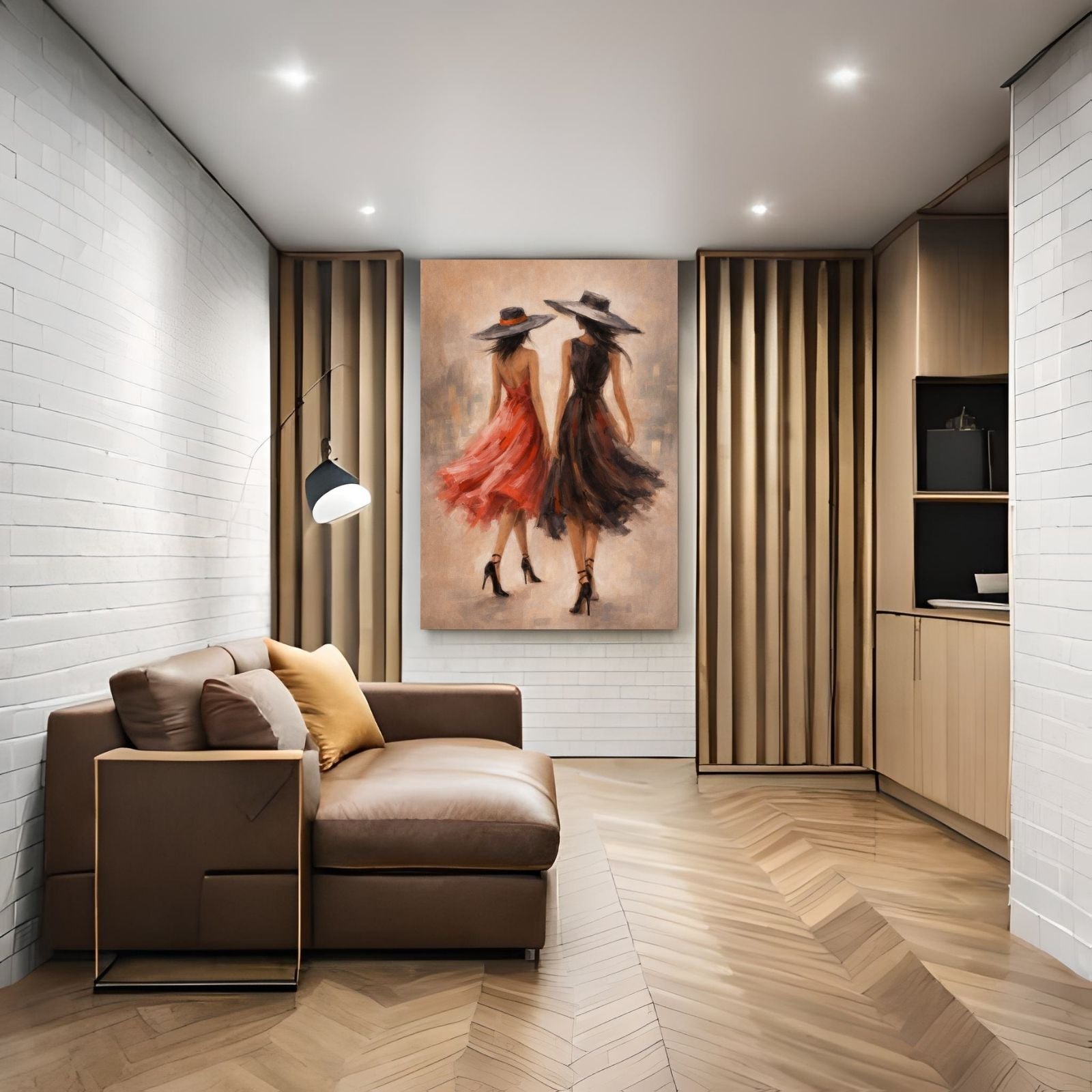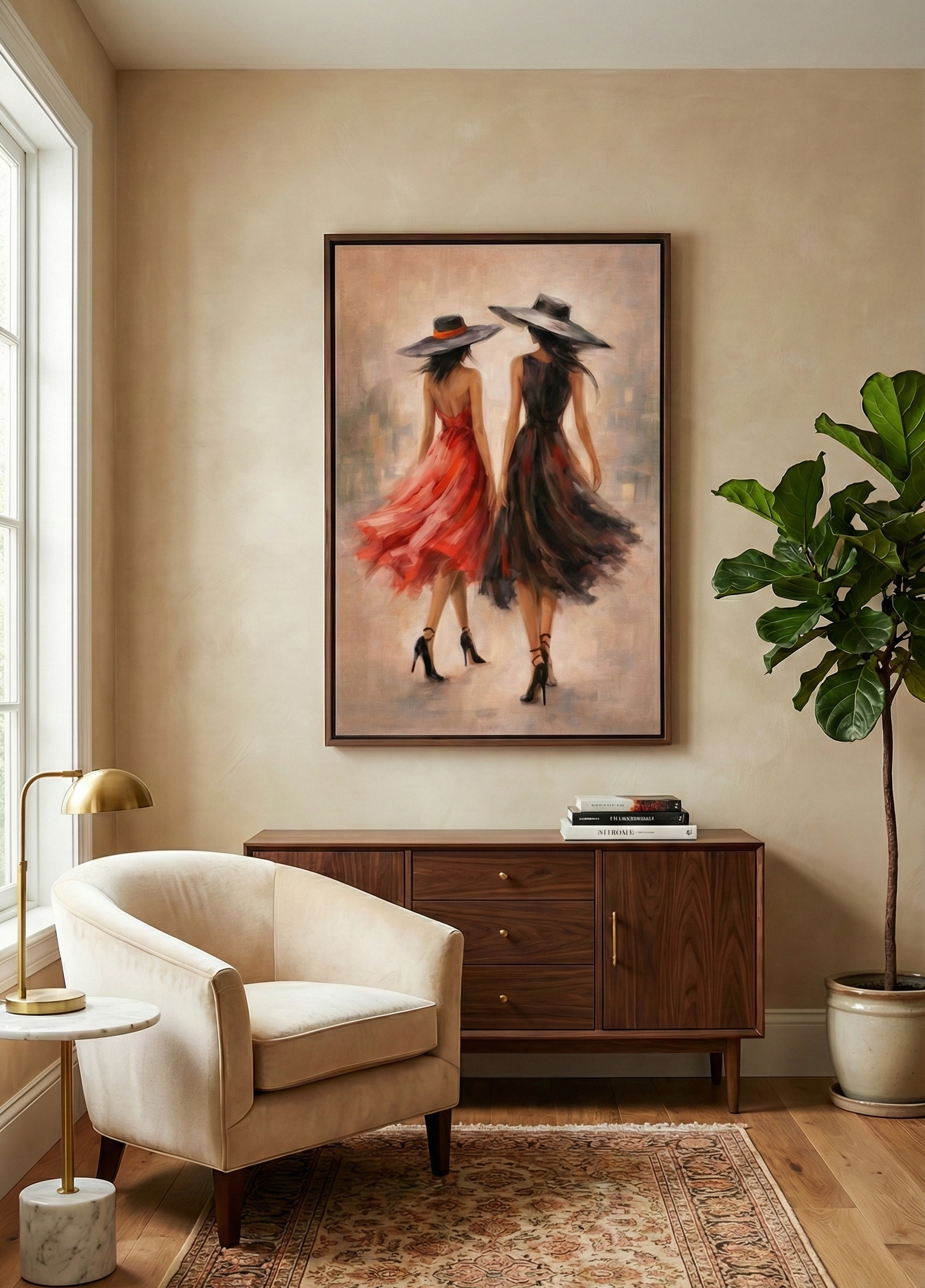 A Vision of Urban Elegance and Effortless Style City Stroll is a sophisticated work of modern figurative art that captures the glamorous essence of a metropolitan afternoon. This piece is more than just decoration; it is designed for those who want fashionable wall art for walk-in closets, luxury master suites, and stylish living areas that tells a story of friendship, confidence, and timeless allure.