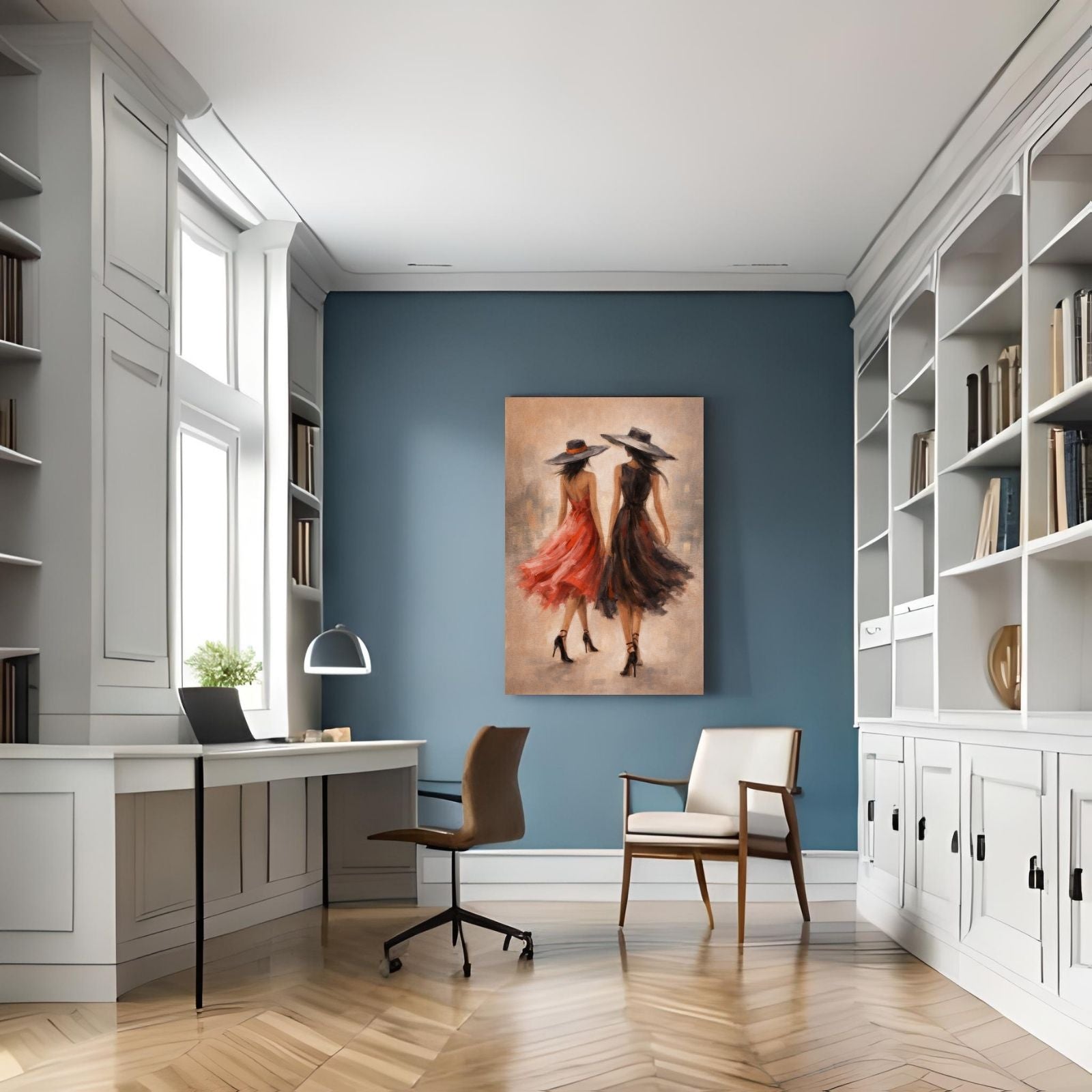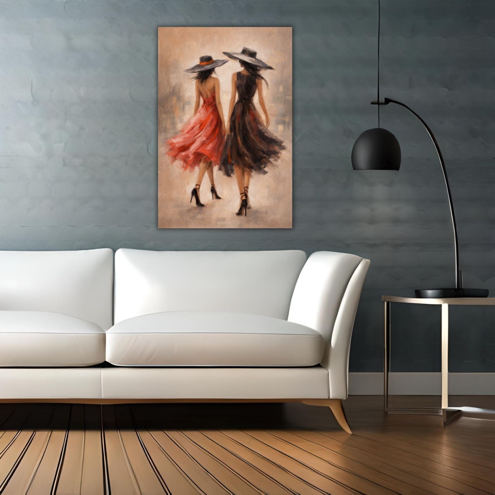The artwork features two slender figures in flowing red and black gowns, adorned with wide-brimmed hats, as they walk through a soft-focus city backdrop. It evokes a couture home aesthetic, perfect for creating a space that feels poised and fashionable. This painting features a classic figurative wall decor palette of bold crimson, charcoal black, and neutral taupe that adds an air of runway sophistication to any interior.