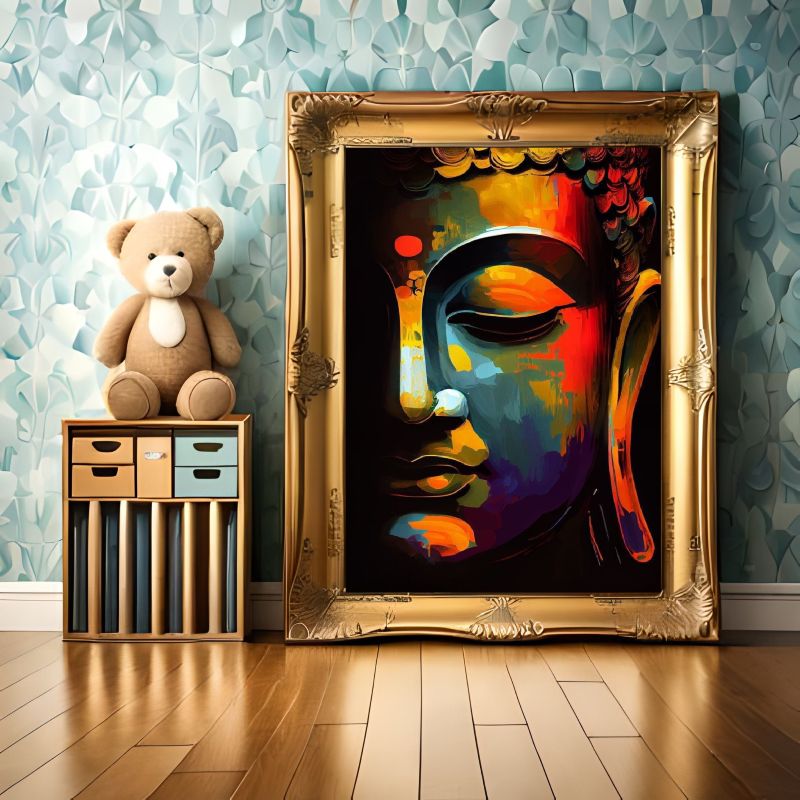Colorful Zen: Buddha Portrait is a stunning artwork that blends vibrant colors. This modern Buddha wall art is perfect for enhancing meditation spaces, yoga studios, or contemporary home decor. With its bold hues and serene expression, it embodies mindfulness, harmony, and inner peace.