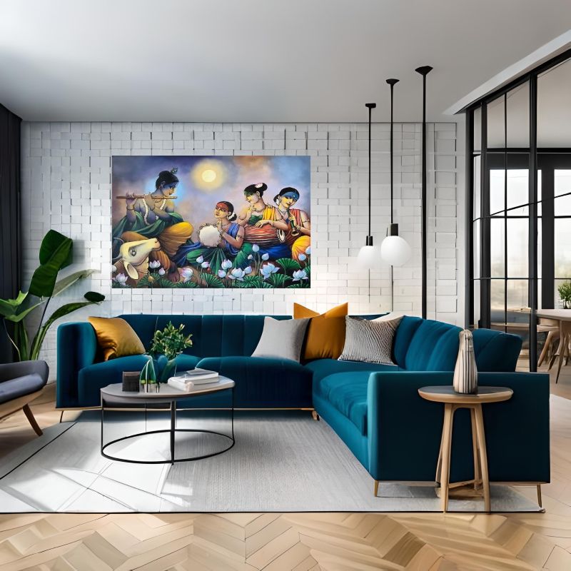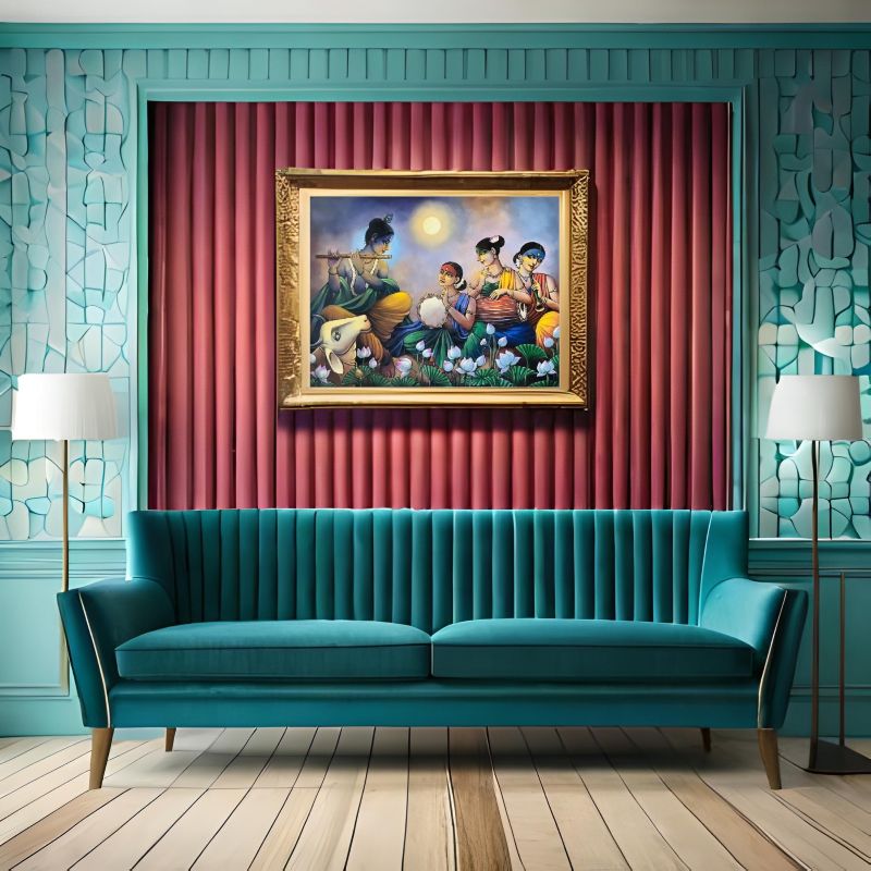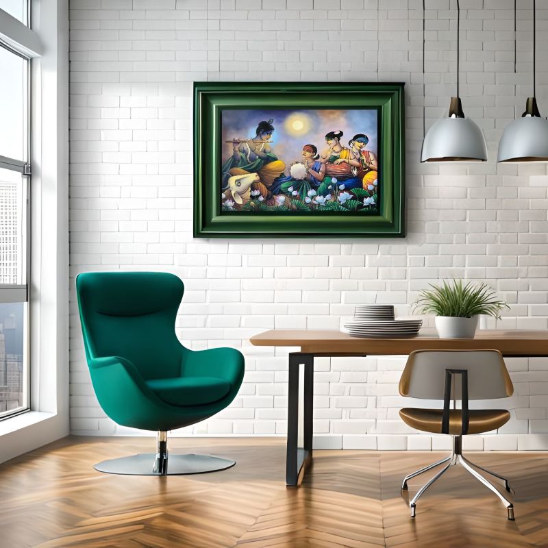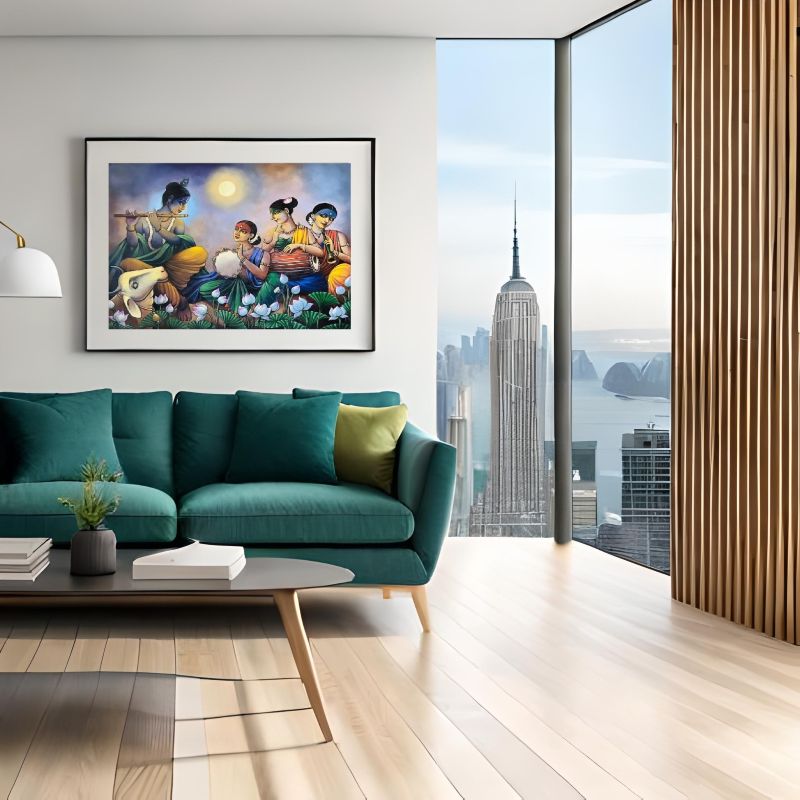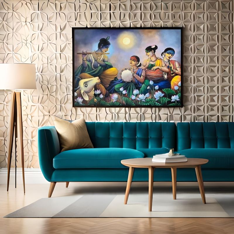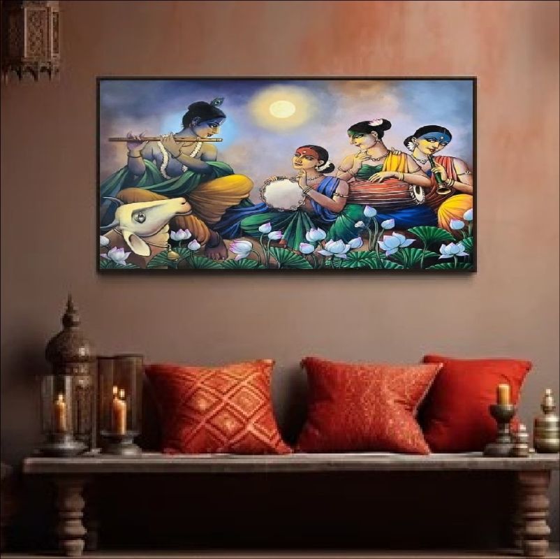"Krishna’s Melodic Bliss" is a stunning painting depicting Krishna playing his flute, surrounded by Gopis in a serene lotus pond under a moonlit sky. This vibrant artwork captures the essence of divine love, harmony, and devotion, making it a perfect addition to your home decor or spiritual space. Ideal for art enthusiasts and admirers of Indian mythology, this masterpiece celebrates Krishna’s musical symphony and the Gopis’ devotion. Whether as a centerpiece or a meaningful gift, this painting radiates peace, cultural heritage, and timeless beauty. Bring the magic of Krishna's divine melody to your space today.