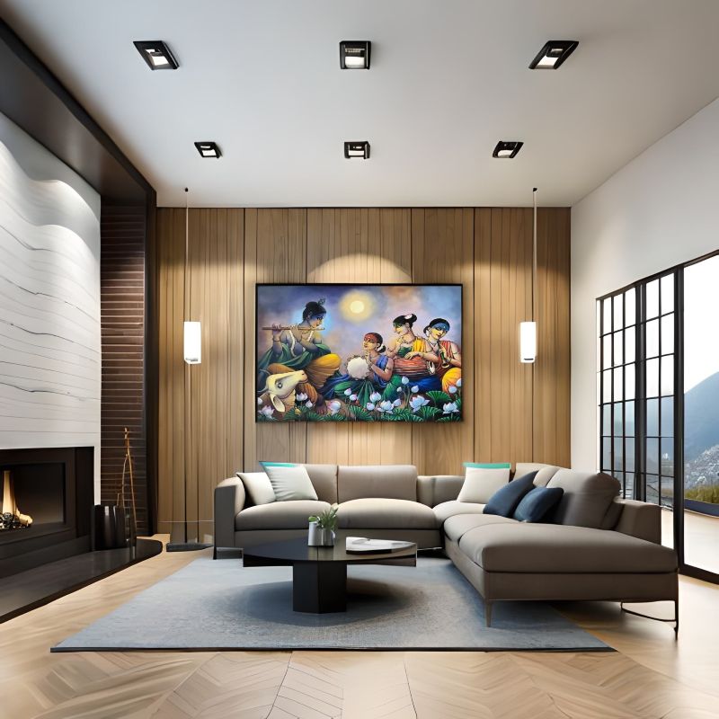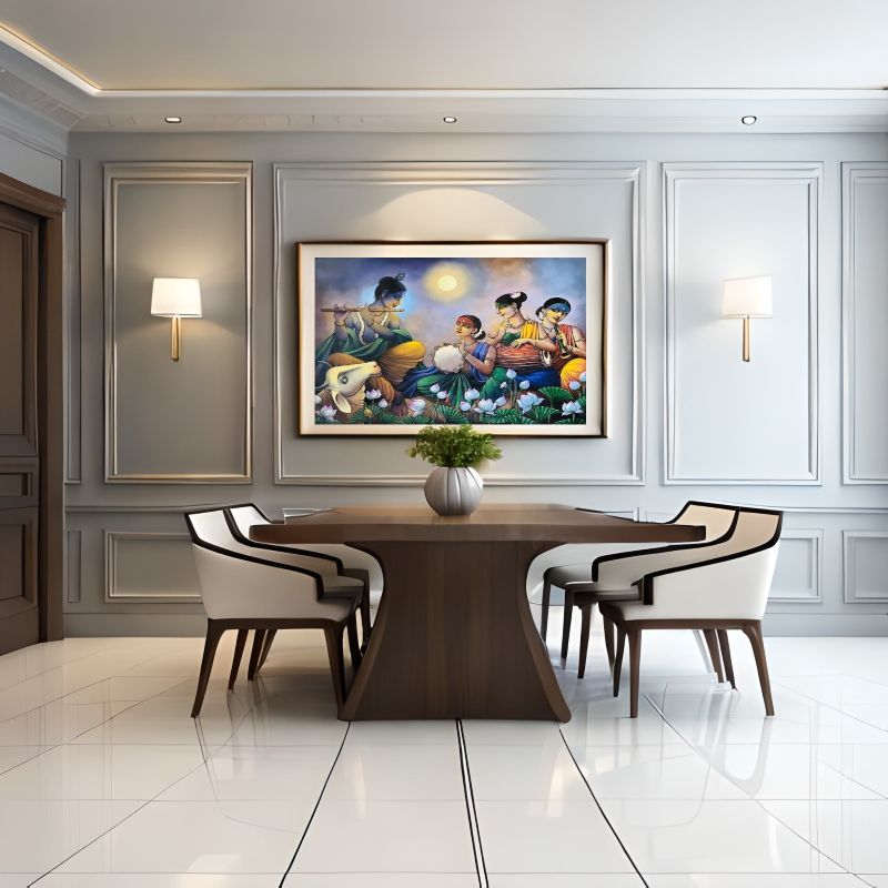 "Krishna's Melodic Bliss" is a stunning painting depicting Krishna playing his flute, surrounded by Gopis in a serene lotus pond under a moonlit sky. This vibrant artwork captures the essence of divine love, harmony, and devotion, making it a perfect addition to your home decor or spiritual space. Ideal for art enthusiasts and admirers of Indian mythology, this masterpiece celebrates Krishna's musical symphony and the Gopis' devotion. Whether as a centerpiece or a meaningful gift, this painting radiates peace, cultural heritage, and timeless beauty. Bring the magic of Krishna's divine melody to your space today.