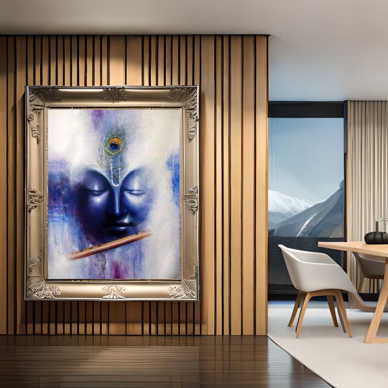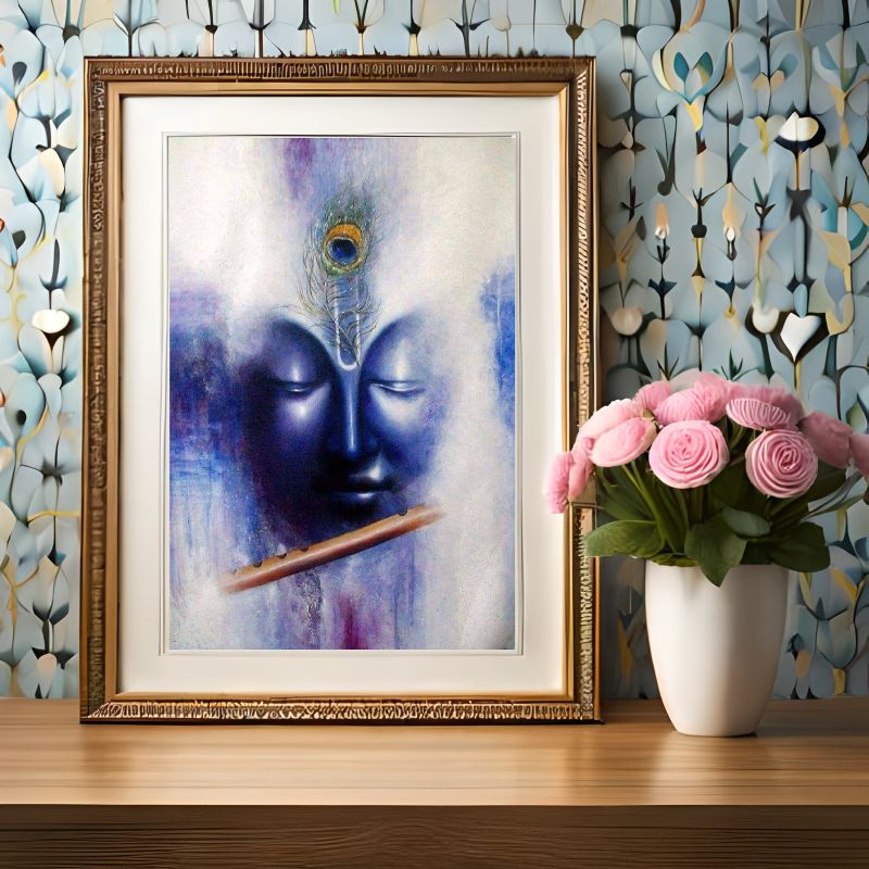 Divine Stillness: Krishna's Face and Flute of Bliss is a captivating spiritual artwork that embodies serenity, devotion, and divine harmony. This exquisite painting showcases Krishna's tranquil face adorned with a mystical peacock feather, complemented by the iconic flute, symbolizing love and peace. Perfect for enhancing meditation spaces, spiritual corners, or elegant home decor, this masterpiece resonates with art lovers, collectors, and spiritual seekers. Whether as a thoughtful gift or a centerpiece for your home, this artwork celebrates Krishna's essence and the timeless beauty of divine stillness.