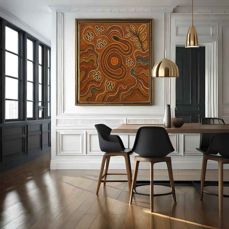 This vibrant Aboriginal dot painting honors the Rainbow Serpent — a powerful figure in Indigenous Dreamtime stories. Flowing lines, earthy tones, and sacred symbols tell a visual story of life, movement, and creation. Hand-painted or available as fine art prints, this piece brings cultural depth and storytelling to any space.