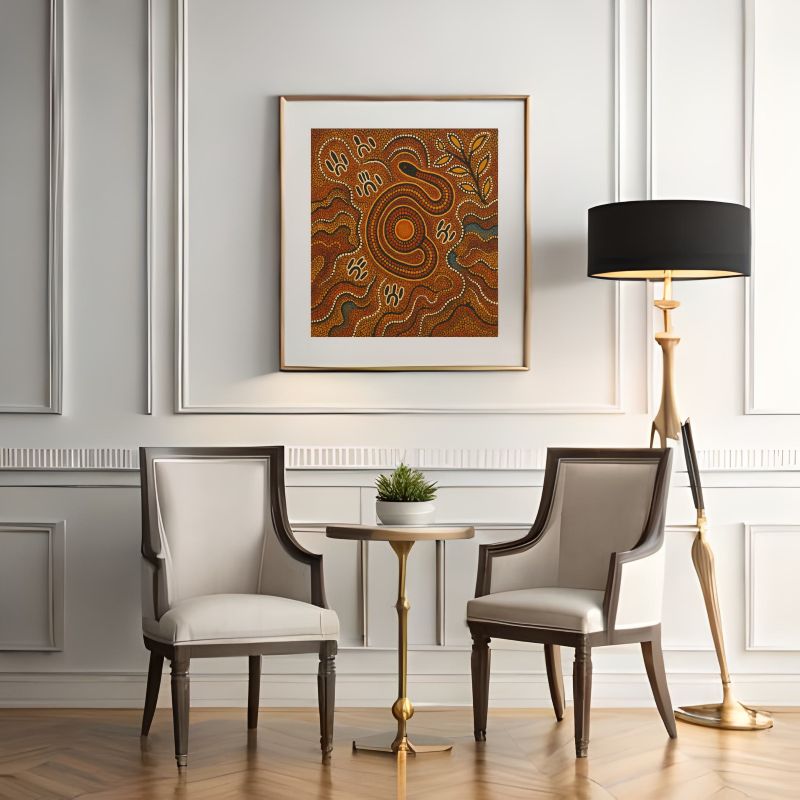 The painting centers on the Rainbow Serpent, a significant figure in Dreamtime lore, depicted in flowing curves amidst a landscape of intricate dots and traditional symbols. Rich in warm ochres, deep browns, and vibrant oranges, the palette reflects the raw beauty of the Australian outback. This Aboriginal dot painting brings a sense of movement and spiritual depth to any room, making it a perfect conversation piece for modern boho interiors or heritage-inspired spaces.