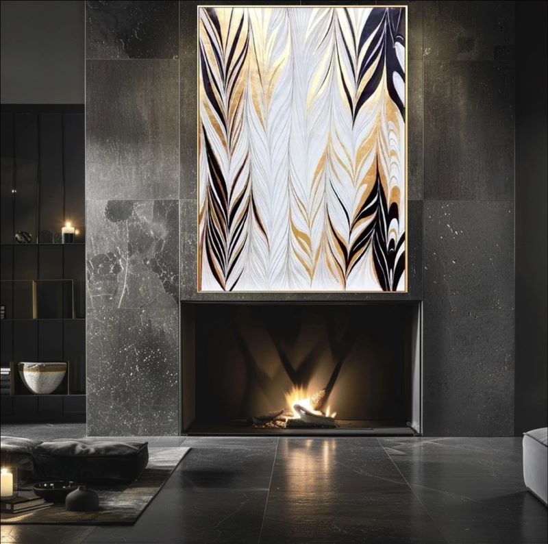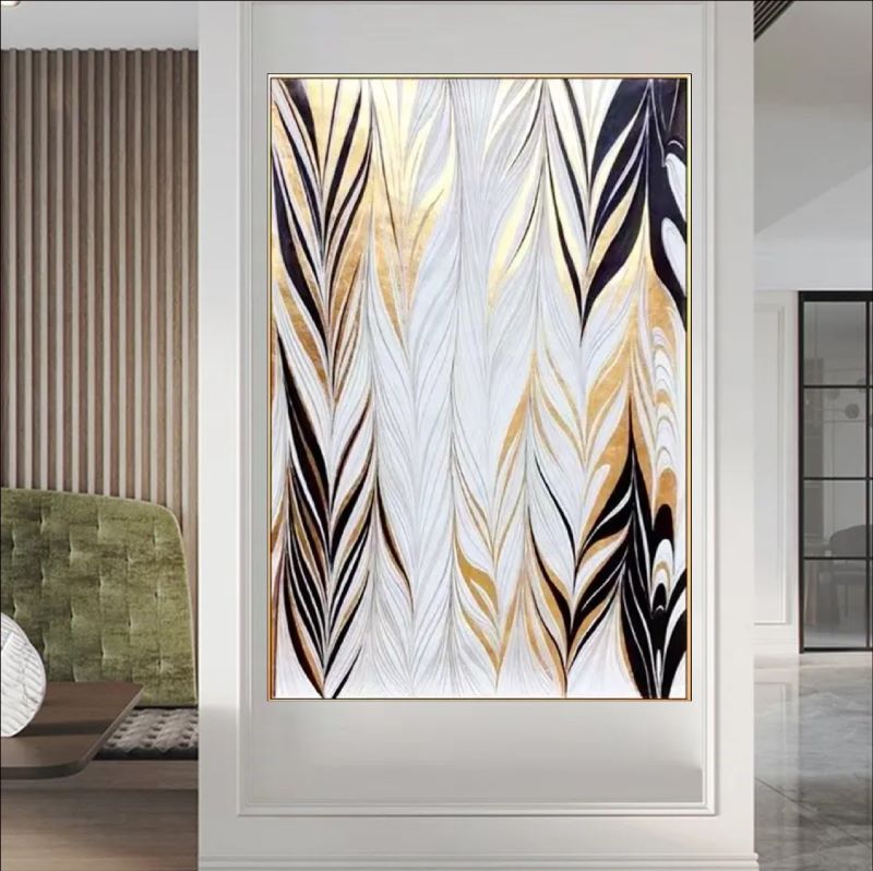 A Symphony of Grace and Luxury Feathers of Elegance is a sophisticated piece of modern abstract art that brings a luxurious rhythm to your walls. Designed for those who appreciate contemporary glam decor and fluid patterns, this painting combines delicate natural forms with a bold, high-contrast palette.