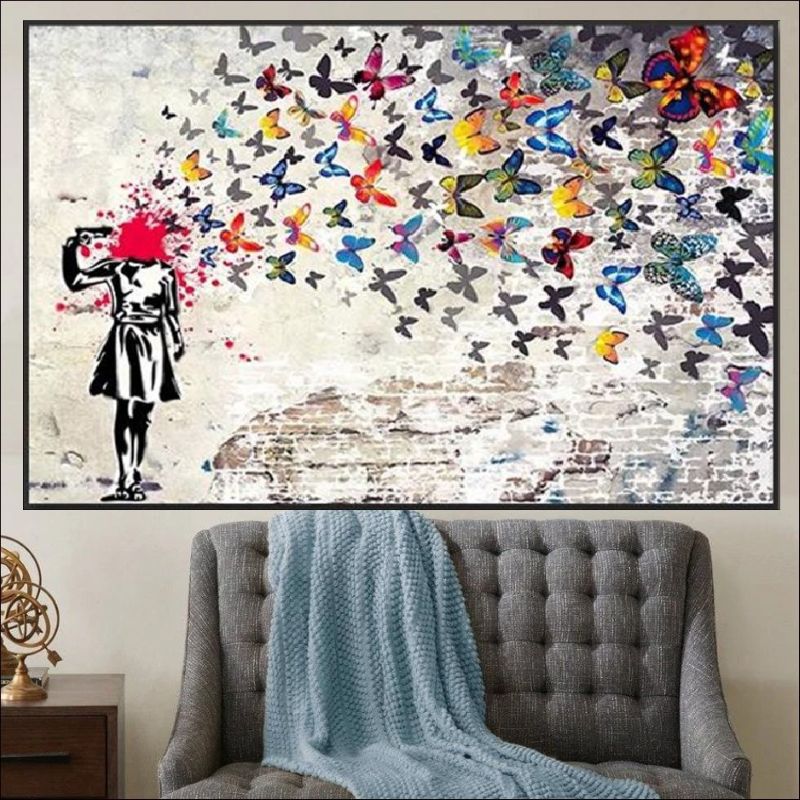 The painting features a black-and-white stencil silhouette of a figure, but instead of violence, the action releases a magnificent swarm of colorful butterflies. Set against a textured, grunge brick-wall background, this graffiti wall art symbolizes the release of creativity, freedom, and the conversion of chaos into beauty. It is an unmissable statement piece for industrial lofts, modern apartments, or creative studios seeking urban home decor with a deep message.