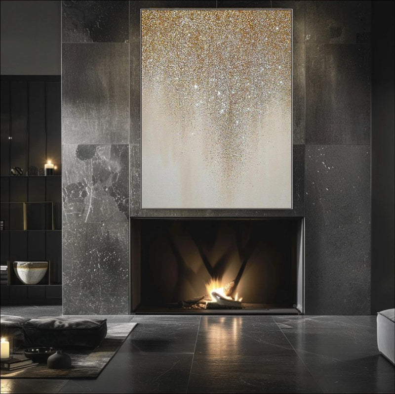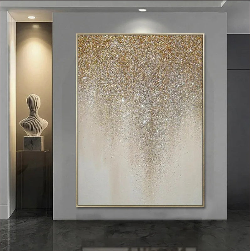 Enhance your space with this exquisite Golden Glitter Drip Art, a luxurious wall décor piece perfect for modern and contemporary interiors. Featuring a shimmering cascade of golden glitter on a neutral canvas, this artwork radiates elegance and sophistication, making it ideal for homes, offices, or galleries. Its textured metallic finish creates a captivating visual effect, reflecting light beautifully to transform any room. Perfect for those seeking luxury canvas wall art, gold abstract paintings, or modern textured décor, this masterpiece complements minimalist, industrial, and opulent design styles alike. Add a touch of timeless glamour to your interior with this stunning golden glitter wall art that is designed for global tastes and trends