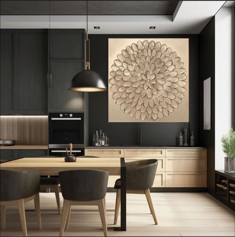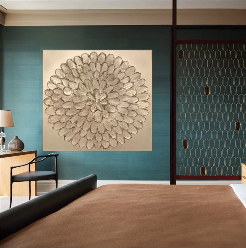 A Radiance of Texture and Light Golden Petal Symphony is a luxurious piece of abstract floral art that brings a warm, metallic glow to your interior. Designed for those who appreciate elegant wall decor and intricate detailing, this painting serves as a sophisticated centerpiece that mimics the timeless beauty of a blooming flower or a sacred mandala.