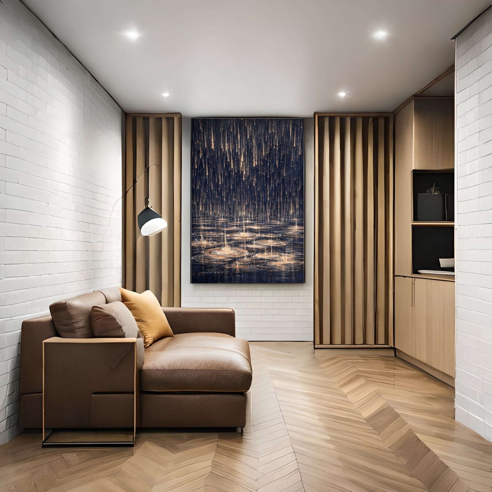 A Symphony of Light and Midnight Tones Golden Rain is a mesmerizing work of modern abstract art designed to bring a sense of mystery and luxury to your living space. This piece is more than just decoration; it is meant for people who want unique wall art for elegant bedrooms and sophisticated lounge areas that tells a story of quiet beauty and movement.