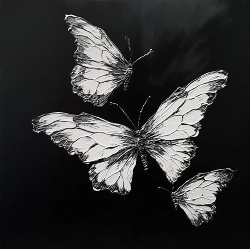 Grace in Shadow is a striking monochromatic painting that captures the delicate beauty of three white butterflies in flight against a deep, dark background. The contrast between the luminous, intricate details of the butterfly wings and the shadowy void creates an evocative interplay of light and darkness, symbolizing elegance and mystery. Each butterfly seems to glide effortlessly, their graceful forms embodying freedom and tranquility. This artwork invites viewers to reflect on the harmony between fragility and strength, offering a serene yet powerful visual experience.