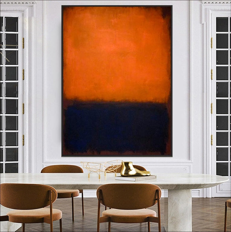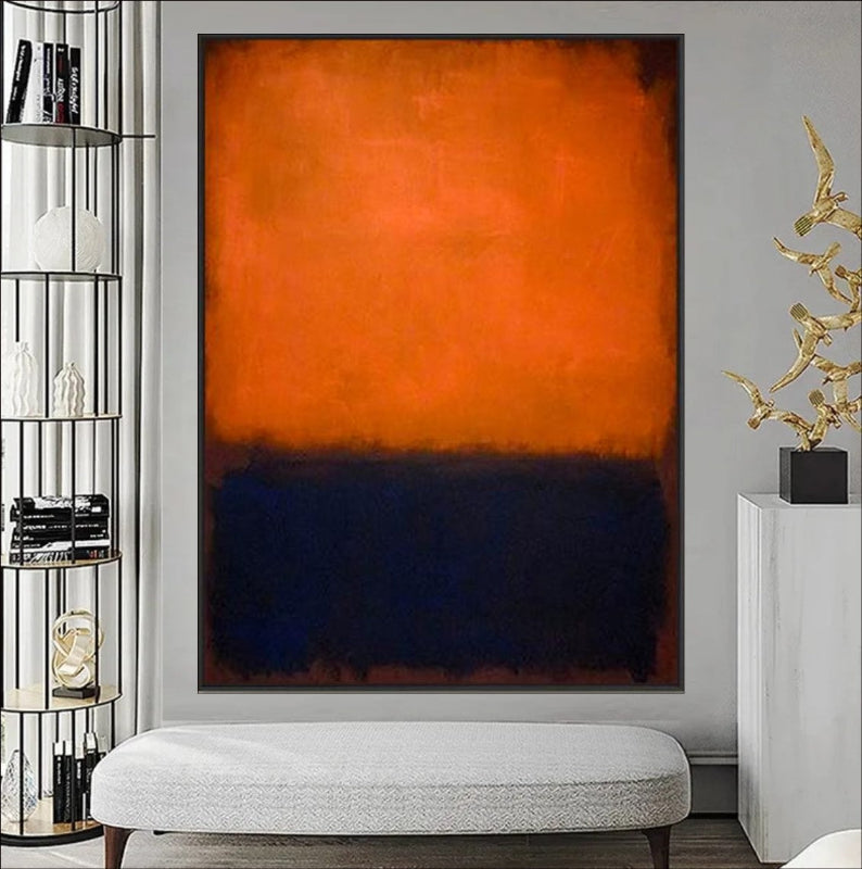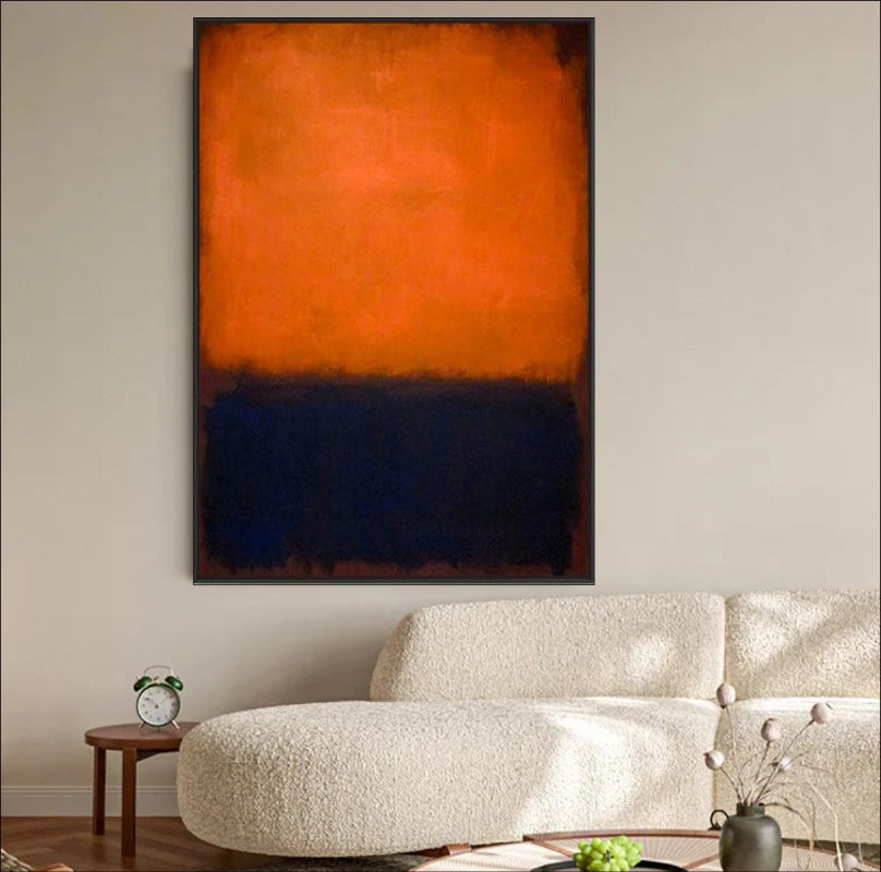 Crafted to evoke a sense of balance and depth, this artwork is ideal for art lovers seeking unique abstract wall art or a modern color block design. The vivid orange radiates energy, while the deep blue exudes calm, making it a versatile addition to any room.