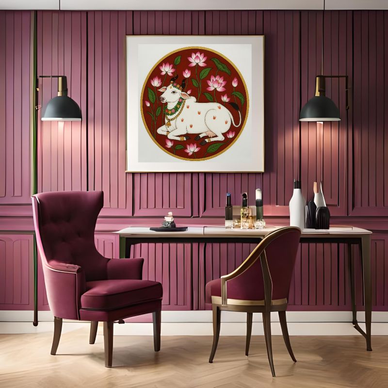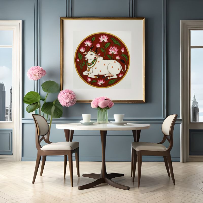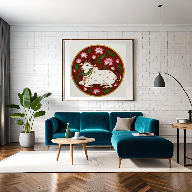 This charming Pichwai painting features a white cow adorned with floral garlands and gold jewelry, peacefully resting in a blooming lotus garden. The deep red background and circular frame add elegance and richness to this classic Indian folk art style.