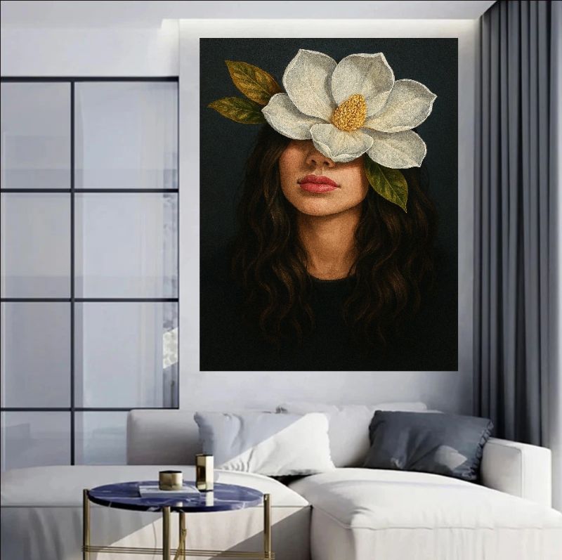 The painting features a striking portrait of a woman, her vision replaced by a magnificent, unfolding white magnolia flower. Set against a dramatic dark background, the contrast highlights the delicate texture of the petals and the realism of her features. This statement wall art perfectly balances elegance with the avant-garde, making it an ideal choice for contemporary living rooms, master bedrooms, or creative spaces seeking a touch of feminine mystery.