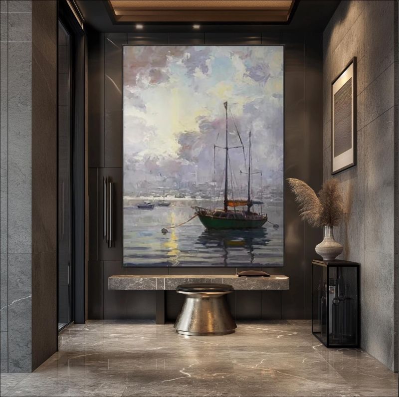 The artwork features a solitary sailboat anchored in a quiet harbor, painted in a soft, impressionistic style. The muted palette of misty greys, gentle blues, and the faint golden reflection of the morning sun on the water creates a deeply atmospheric mood. This nautical wall art is the perfect choice for bathrooms, bedrooms, or coastal living rooms, offering a timeless sense of peace and tranquility.
