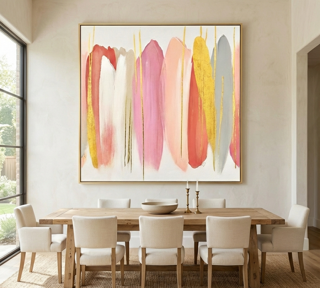 A Harmonious Dance of Color and Shimmer Pastel Petals is a sophisticated work of modern botanical art designed to bring a soft, contemporary energy to your living space. This piece is more than just decoration; it is for those who want abstract floral wall art for master suites, chic dressing rooms, and light-filled studios that celebrates the essence of a garden through fluid, expressive movement.