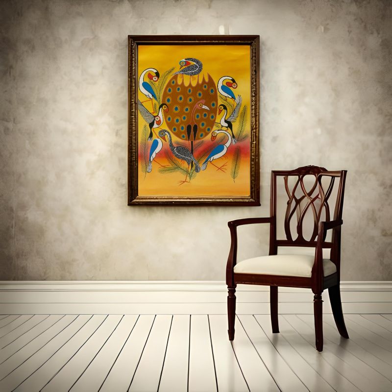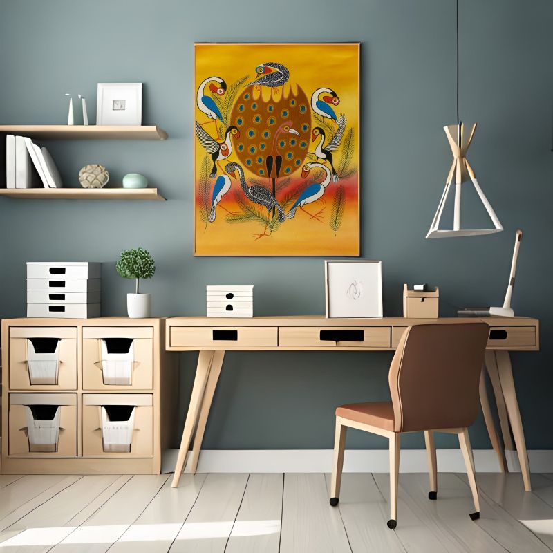 The artwork features a vibrant flock of stylized birds, their exaggerated forms and intricate dotted patterns standing out against a radiant yellow sun-drenched background. A central peacock-inspired motif anchors the composition, creating a dynamic visual rhythm. With its bold primary colors and high-energy contrast, this wildlife wall art is the perfect choice for Afro-inspired home decor, gallery walls, or any space needing a joyful splash of color.