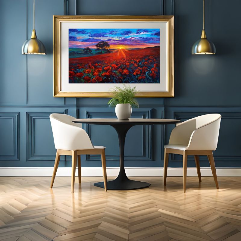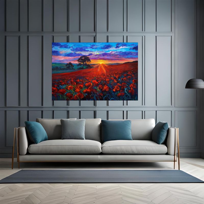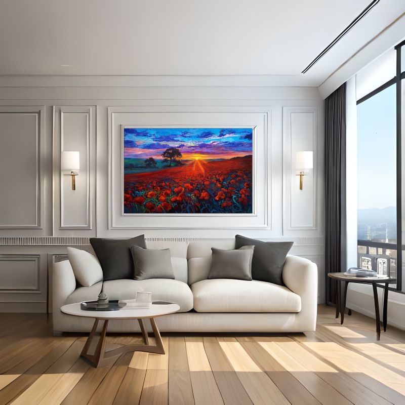 Experience the breathtaking beauty of "Poppy Paradise: A Golden Hour Landscape," a vibrant artwork that captures the glowing hues of sunset over a field of red poppies. This stunning piece celebrates the harmony of nature's colors, blending fiery skies with the serene charm of blooming flowers. Perfect for those seeking "poppy field wall art," "sunset landscape paintings," or "nature-inspired decor," this artwork adds warmth and elegance to any space. Whether adorning your home, office, or gallery, it brings the tranquility and brilliance of golden hour into your surroundings, making it a timeless masterpiece