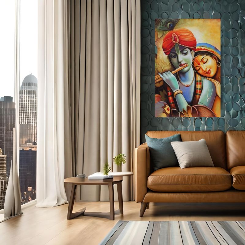 Experience the timeless love of Radha and Krishna with this exquisite artwork. Perfect for spiritual spaces, home decor, or as a meaningful gift.This vibrant artwork of Radha and Krishna showcases their eternal bond of love and devotion. Ideal for adding a touch of divinity to your spiritual space, yoga studio, or home decor, it's a perfect gift for festivals, weddings, or religious celebrations.