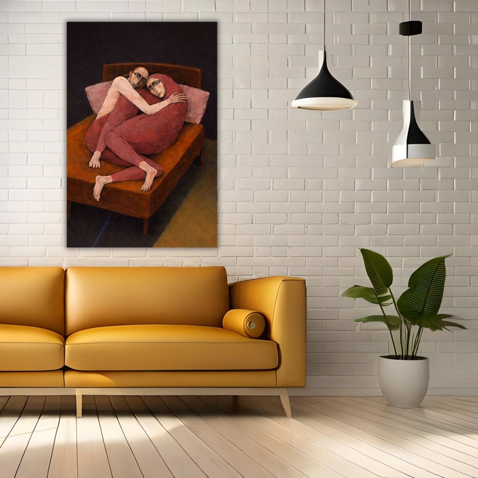 A Visual Poem of Comfort and Shared Vulnerability Resting Souls is a profound work of modern figurative art that captures the raw, quiet beauty of human intimacy. This piece is more than just decoration; it is designed for those who want expressive wall art for master bedrooms, private studies, and contemplative living spaces that tells a story of deep connection, safety, and mutual support.