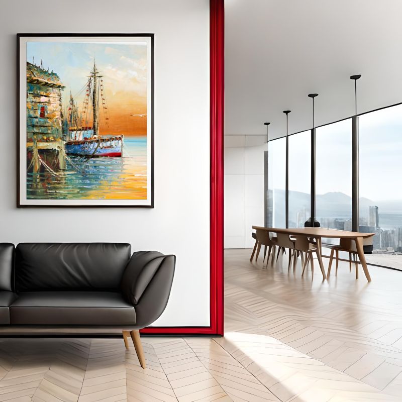 Experience the tranquil beauty of 'Sailboats at Sunset,' a captivating nautical painting that brings the serenity of a coastal sunset to life. This artwork features vibrant hues and intricate details, depicting sailboats gently docked by the harbor, reflecting in the shimmering waters. Perfect for enhancing modern coastal decor or adding a touch of elegance to any interior, this piece resonates with art lovers and maritime enthusiasts alike. Its warm tones and nautical landscape design make it a timeless addition to homes, offices, or galleries worldwide. Elevate your space with this globally inspired masterpiece of sunset seascape art.