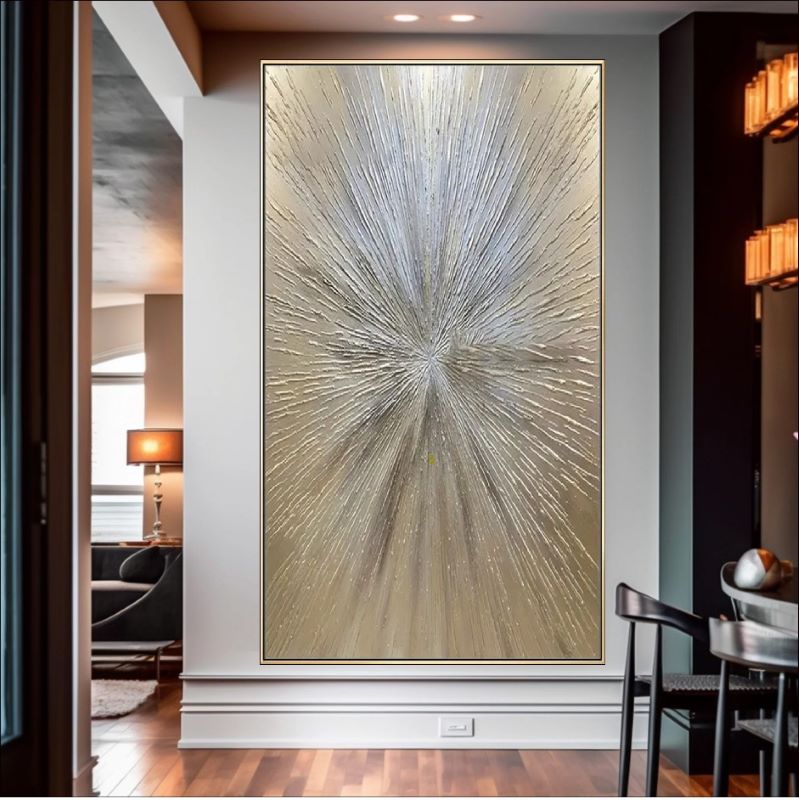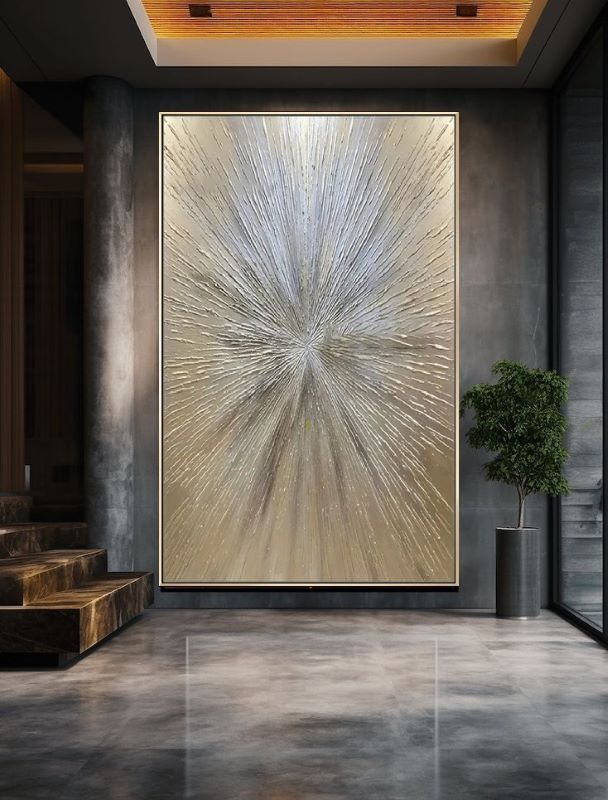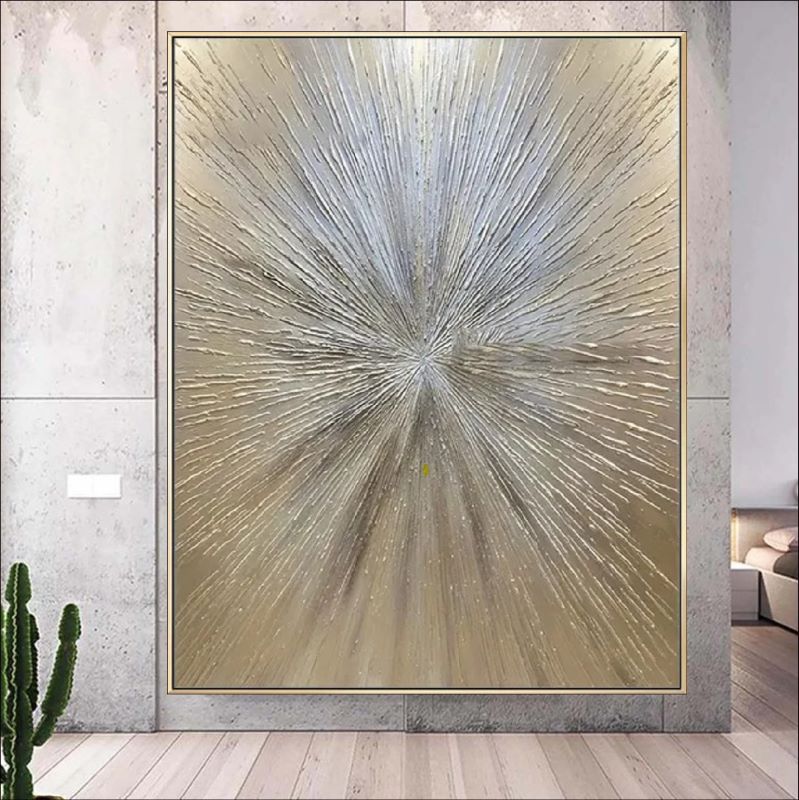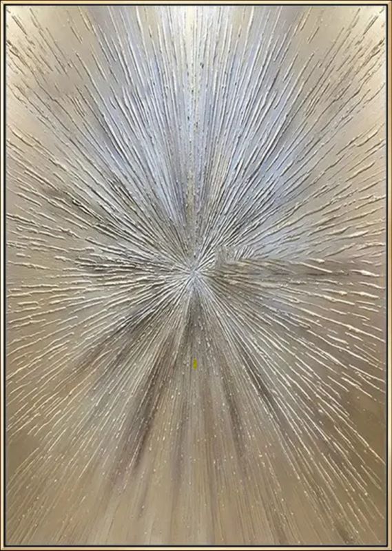 "Shimmering Eternity" is a breathtaking abstract artwork that exudes timeless elegance and radiant energy. Featuring textured golden and metallic tones, this piece captures the essence of a luminous burst, evoking the brilliance of starlight and the grandeur of celestial phenomena. The intricate details and dynamic flow create a mesmerizing focal point, bringing depth and sophistication to any space.