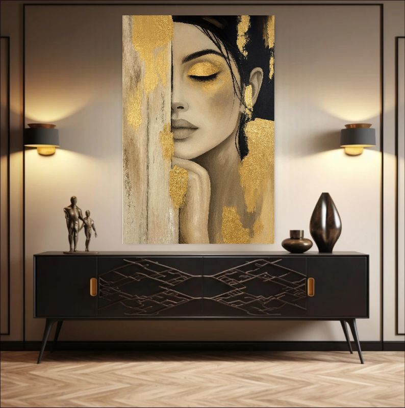 A Touch of Golden Luxury Golden Serenity is a radiant piece of modern abstract portraiture that brings warmth and sophistication to your sanctuary. Designed for those who love minimalist luxury and textural depth, this artwork balances bold metallic accents with soft, feminine grace.
