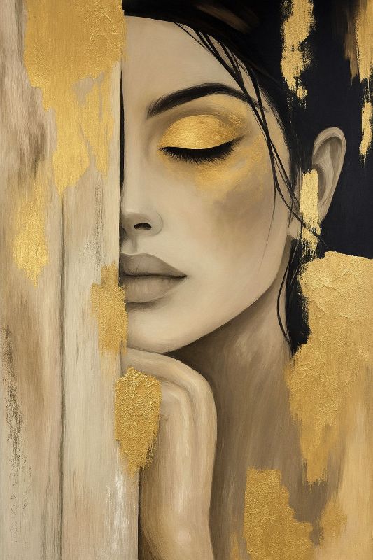 The painting features a close-up of a woman in deep contemplation, her features illuminated by striking gold leaf details. The textured application of gold against muted neutral and black tones creates a stunning visual contrast that catches the light. This gold wall art is an impeccable choice for master bedrooms, chic living areas, or any space requiring a touch of modern glamour.