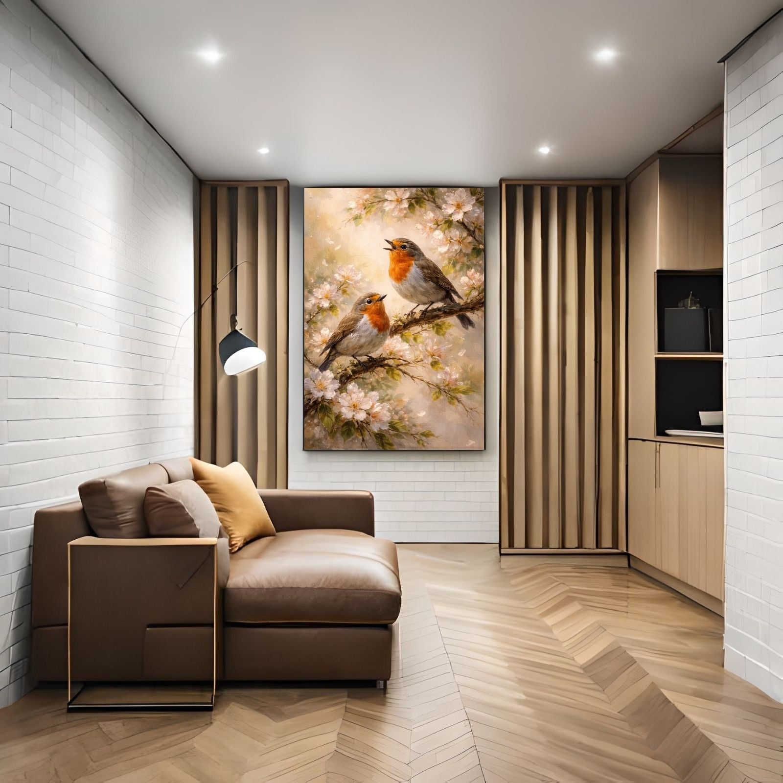 The artwork combines delicate realism with soft, painterly textures to showcase a pair of European Robins perched amidst a flurry of white apple blossoms. It evokes a tranquil home aesthetic, perfect for creating a light and airy atmosphere. This painting features a soft wildlife wall decor palette of warm oranges, gentle creams, and fresh spring greens that adds a touch of natural elegance to any interior.