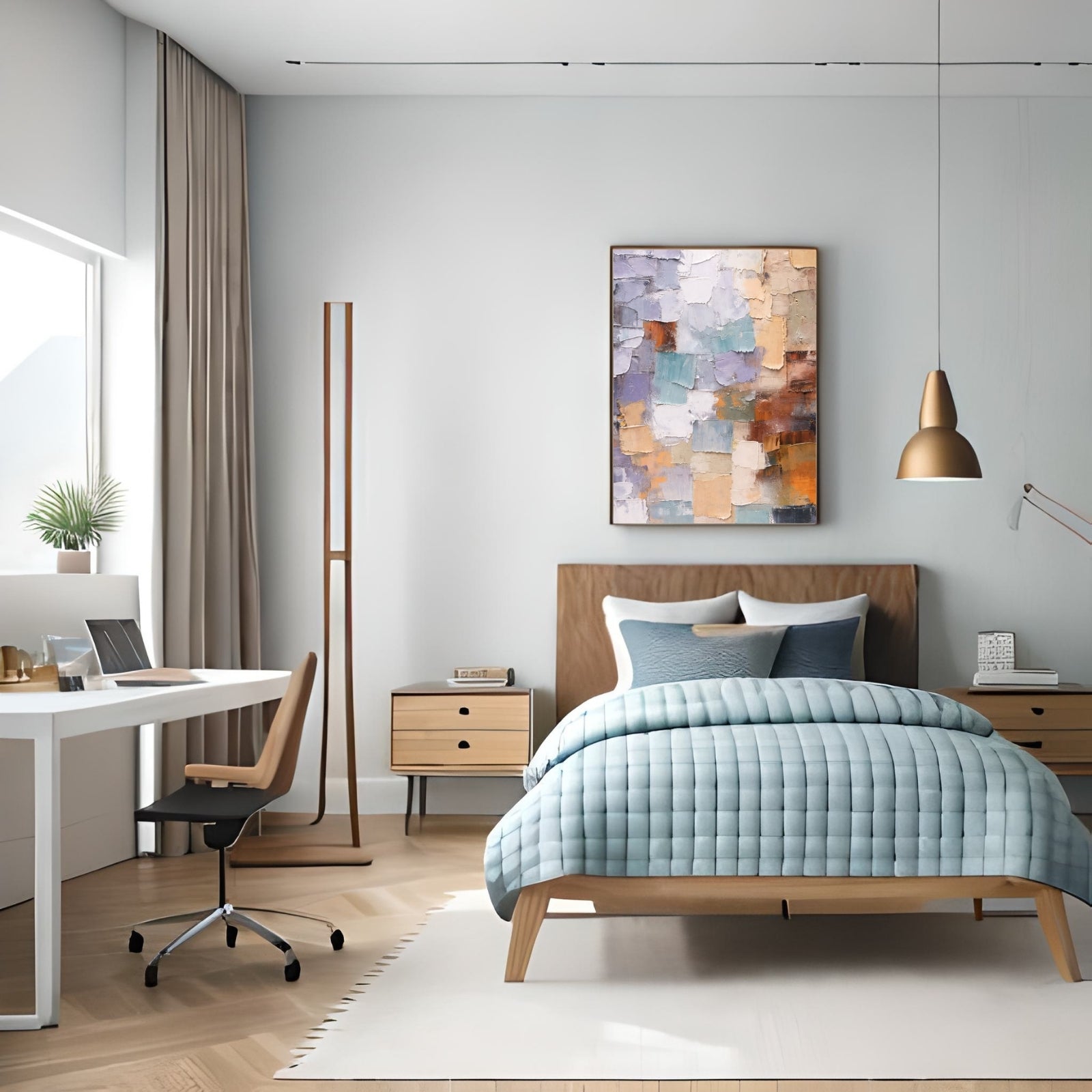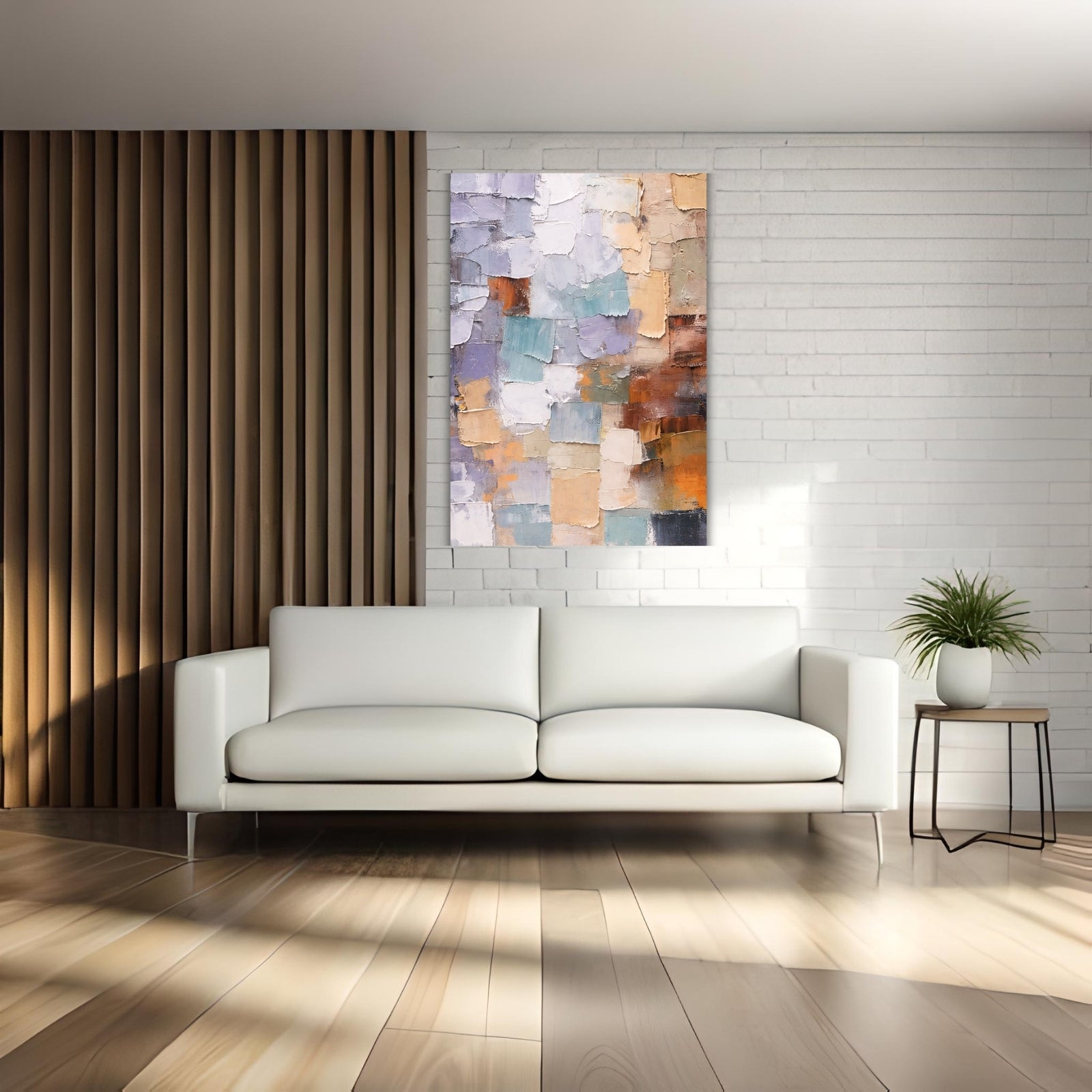 The artwork utilizes broad, rectangular palette knife strokes to create a mosaic-like surface that plays beautifully with light and shadow. It evokes the ultimate grounded home aesthetics, perfect for creating a peaceful and cohesive environment. This painting features a rich abstract wall décor palette of soft lavender, warm terracotta, slate blue, and sandy beige that instantly makes any space feel more sophisticated and balanced.
