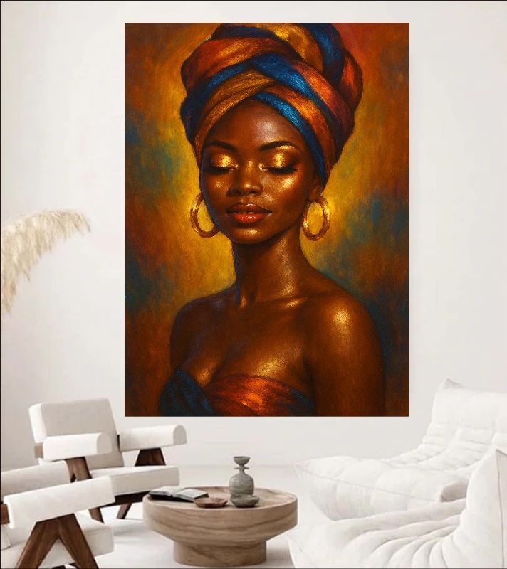 Celebrate the beauty and strength of African women with this vibrant portrait art print. Featuring bold colors, golden eyeshadow, and a colorful headwrap, this empowering wall art adds culture and elegance to any space. A perfect blend of modern African art and inspirational female portrait for your home or office decor.
