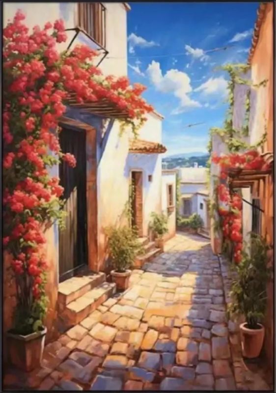 A Journey to Sun-Drenched Cobblestones Village Bloom is a captivating piece of Mediterranean art that transports you to the heart of a rustic, sun-drenched village. Designed for those who love coastal decor and the warmth of old-world charm, this painting adds a sense of calm and wanderlust to your home.